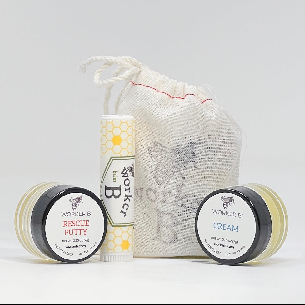Tread with care, for the north is bold. Manage the Minnesota winter with the help of Worker B’s Skincare Survival Sampler Kit. Includes sample sizes of the bare essentials: Lip Balm, Cream and Rescue Putty. NOTE: bag style may differ from image. Sorry, no choice.